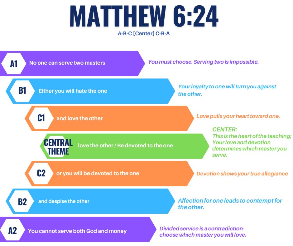 For example, Matthew 6 (illustrated in the image below) uses this structure to contrast the choices we make by where our devotion lies. You’ll see the key to the passage is what the writer tucked into the very center of the verse? The central verse of the chiasm is the image of the person who loves one master and is devoted to that one. The writer, quoting Jesus, wants you to know that’s the heart of the message.